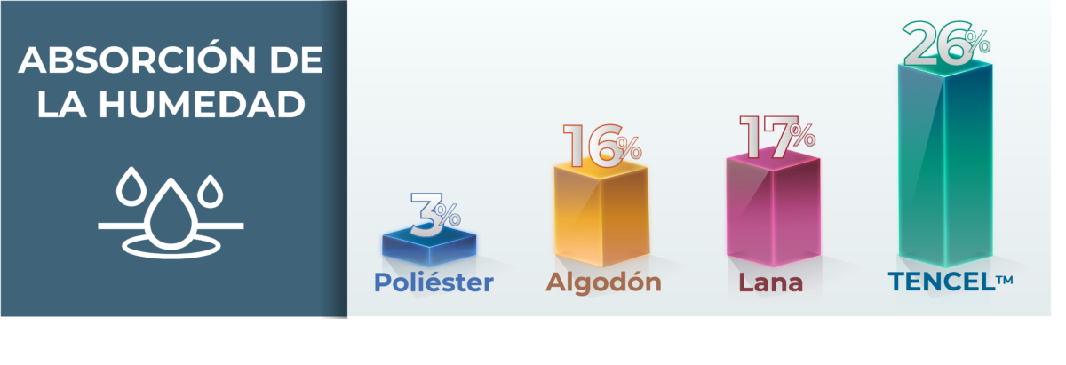 La capacidad de absorción de la humedad de las fibras TENCEL™ es la más alta del mercado, con una distribución mucho más homogénea. Asimismo, su capacidad de disipación y secado es muy superior al del resto de tejidos.
